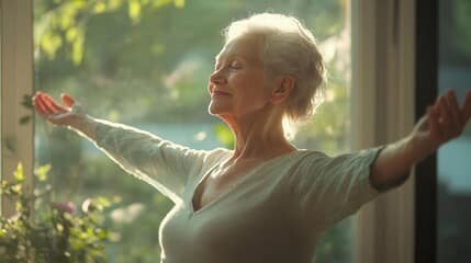 Start your morning with a gentle stretch in bed: lie on your back, knees bent, feet flat on the mattress, arms by your sides. Inhale deeply through your nose, expanding your belly, then exhale slowly. Repeat for one minute to relax the lower back.
