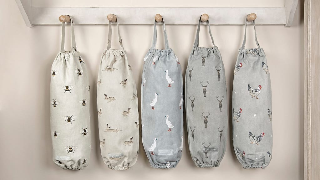 More aesthetically pleasing would be a door-hung canvas bag or these sausage-shaped fabric carrier bag holders which holds approximately 30 bags