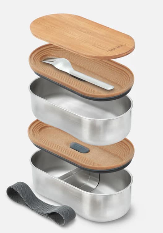 A very handy way to pack food if you need a lunch box. Two leakproof and airtight stainless steel containers with a concealed fork and chopping board.