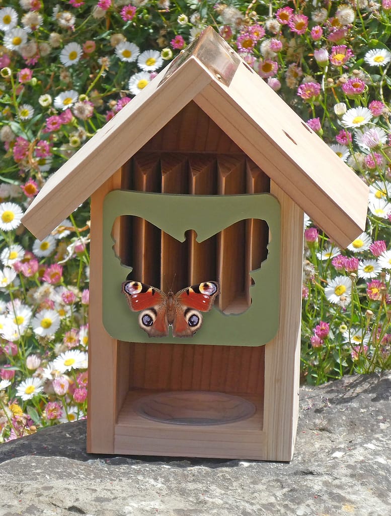 A lovely home for all types of butterflies, moths and many other pollinating insects. It has a slatted centre providing resting and sheltering spots. There is a reservoir at the bottom for butterfly food.